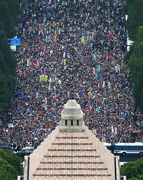 Le 30 août 2015, un grand nombre de personnes ont envahi la rue devant la porte principale du bâtiment de la Diète nationale pour protester contre les projets de loi relatifs à la sécurité en cours d’examen à la Chambre des conseillers. Selon les organisateurs, des manifestations et rassemblements similaires ont eu lieu dans plus de 200 endroits à travers le pays. Les lois relatives à la sécurité comprennent des dispositions approuvées par l’administration Abe lors d’une réunion du cabinet pour permettre l’exercice des droits d’autodéfense collective par le biais d’un changement d’interprétation constitutionnelle, ainsi que pour étendre le soutien logistique aux armées étrangères. Le projet de loi définit une « situation de menace pour l’existence du Japon » comme une situation dans laquelle un pays étroitement lié est attaqué et l’existence du Japon est menacée, et stipule que le Japon peut exercer le droit de légitime défense collective si certaines conditions sont remplies, comme par exemple : n’étant pas doté d’autres moyens appropriés.