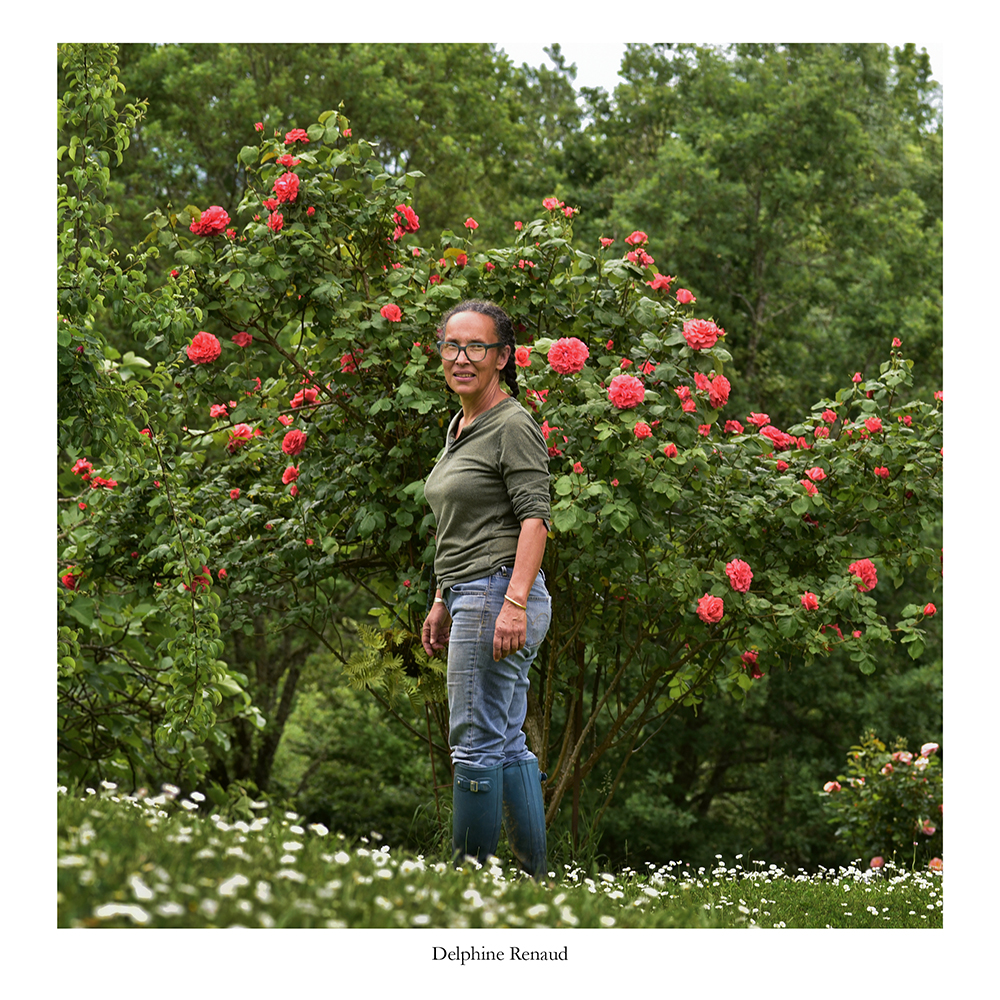 Georges dont le sourire chaleureux et la posture assurée devant une porte rustique ornée d’un cœur témoignent d’une vie solidement bâtie. L’image de Colette et Michel photographiés dans leur potager encadrés par une structure de vigne naissante, renvoie à la patience, au labeur et au lien avec la terre. Celle d’Amandine et Jeoffré est chargé d’une promesse d’avenir. La jeune femme enceinte est rayonnante face à son compagnon, hommage à la jeunesse et à l’espoir qui accompagne l’arrivée d’une nouvelle génération. Avec Delphine, nous plongeons dans un univers de beauté naturelle. Elle est présente devant un magnifique massif de roses aux teintes vives, vêtue de vêtements de travail et de bottes, c’est le témoignage d’une passion pour le jardinage. Quand à Guy, vêtu d’un tablier de cuir, entouré de plaques émaillées et de panneaux de signalisation vintage, la mise en scène suggère l’activité manuelle, la création et un savoir-faire d’artisan.