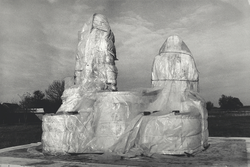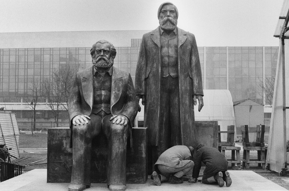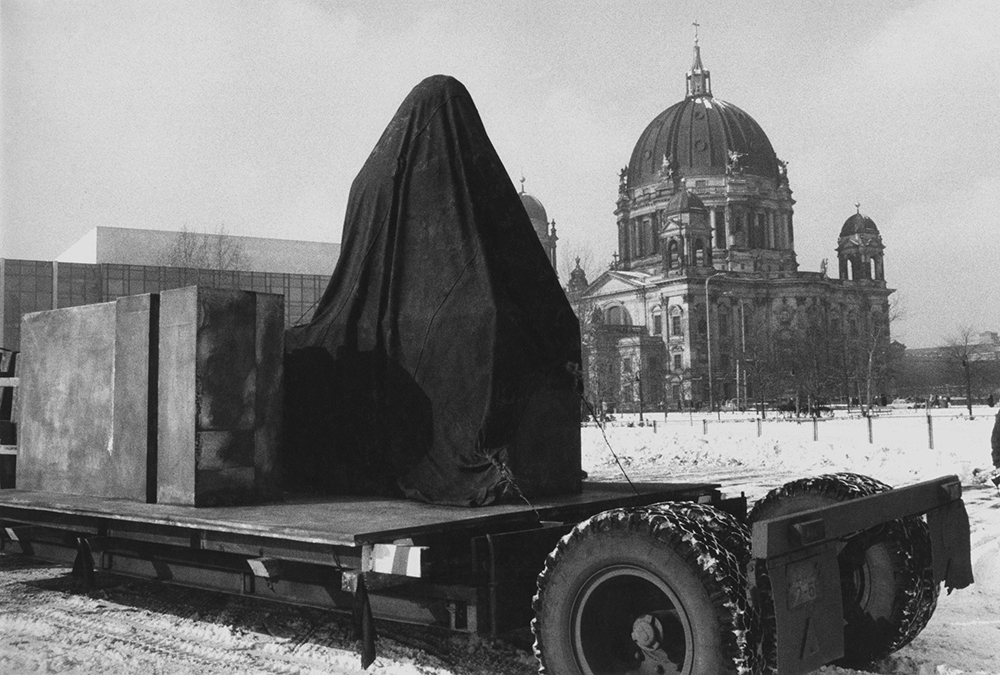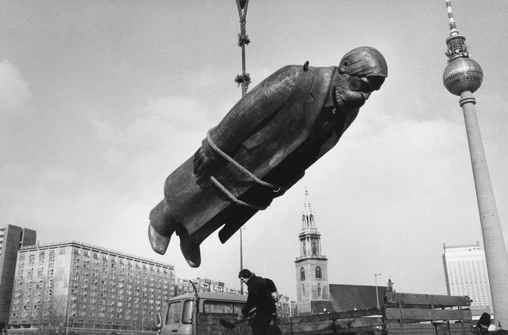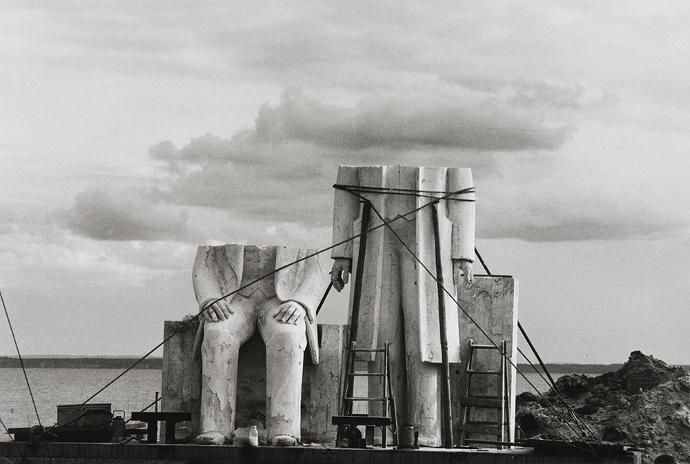 Saut dans le temps et l’espace avec « Le monument » de l’Allemande Sibylle Bergemann (1941-2010). C’est une série de photographies réalisées entre 1975 et 1986 à-propos de l’élaboration du monument à Marx et Engels à Berlin-Est. Pendant onze ans, elle photographiera toutes les étapes de la construction depuis les premières maquettes jusqu’à l’inauguration du monument. Parmi plus de 400 pellicules utilisées, elle retiendra douze photographies réunies sous le titre Das Denkmal (Le Monument). La série révèle un langage visuel aux antipodes des canons officiels. Dans une perspective post-communiste, la déconstruction des héros et l’ironie à l’œuvre ont un caractère annonciateur de ce qui allait effectivement aariver. De fait, ce travail prend deux significations diamétralement opposées selon que l’on la regarde dans un sens ou dans l’autre. On peut soit y voir l’érection d’un hommage aux héros ou bien le déboulonnage des idoles. S’appuyant sur une objectivité rigoureuse, Bergemann a réussi à éviter la censure et à traduire de façon rigoureuse l’obsolescence d’une idéologie.