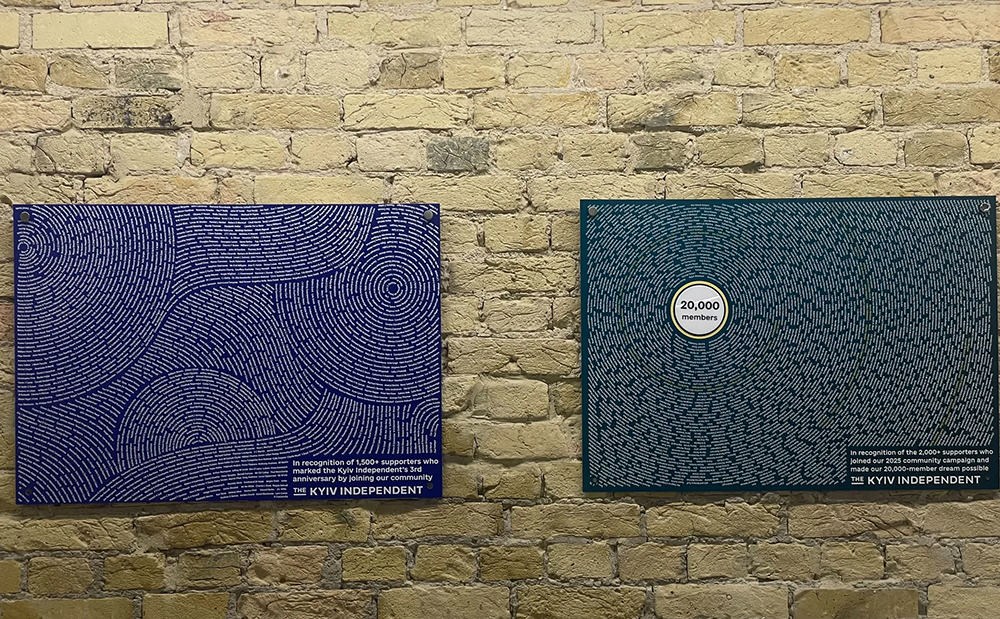 Si vous devenez souscripteur de The Kyiv Independent, vous pourrez trouvez votre nom dans le hall du journal. A gauche, les 10 000 premiers noms ; à droite les 20 000 suivant. Document © The Kyiv Independent