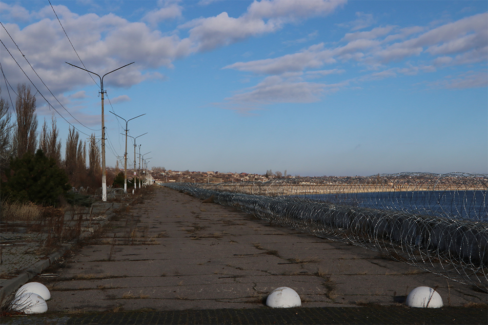 Première surprise, l’escalier de 28 marches qui monte à la digue est du style « coupe jambes », une donnée qui ne peut apparaître sur un Google Street View. Une fois sur la digue, un mur de barbelés de près de deux mètres de haut contrarie la réalisation de clichés corrects et interdit d’accéder au remblai de la digue. Il faut viser à travers le treillage métallique, ce qui prend plusieurs secondes. Beaucoup trop de temps pour un cliché à cet endroit totalement découvert. Se déplacer en arrière pour une vue d’ensemble en amont. Se tourner pour tenter une vue en aval, mais le soleil est contraire. Reculer encore pour immortaliser un canon russe qui a participé à la libération de la ville en février 1944 par les 3e et 4e fronts ukrainiens de l’Armée rouge, toujours intact sur son piédestal de pierre. Ironie de l’histoire, il est tourné vers la ville alors que les canons russes de l’autre côté du fleuve sont aussi en permanence orientés vers Nikopol. Fuir au plus vite, sans glisser dans les marches qui n’ont plus été entretenues depuis trois ans, sans savoir si la menace est devant, derrière, haut-dessus, à gauche, à droite ou si, simplement, il n’y en a pas. Se mettre à l’abri. Puis écouter si le bourdonnement caractéristique d’un drone se fait entendre.
