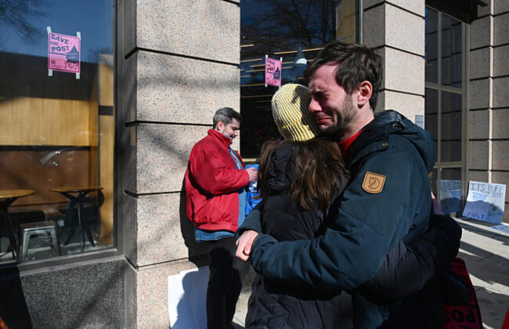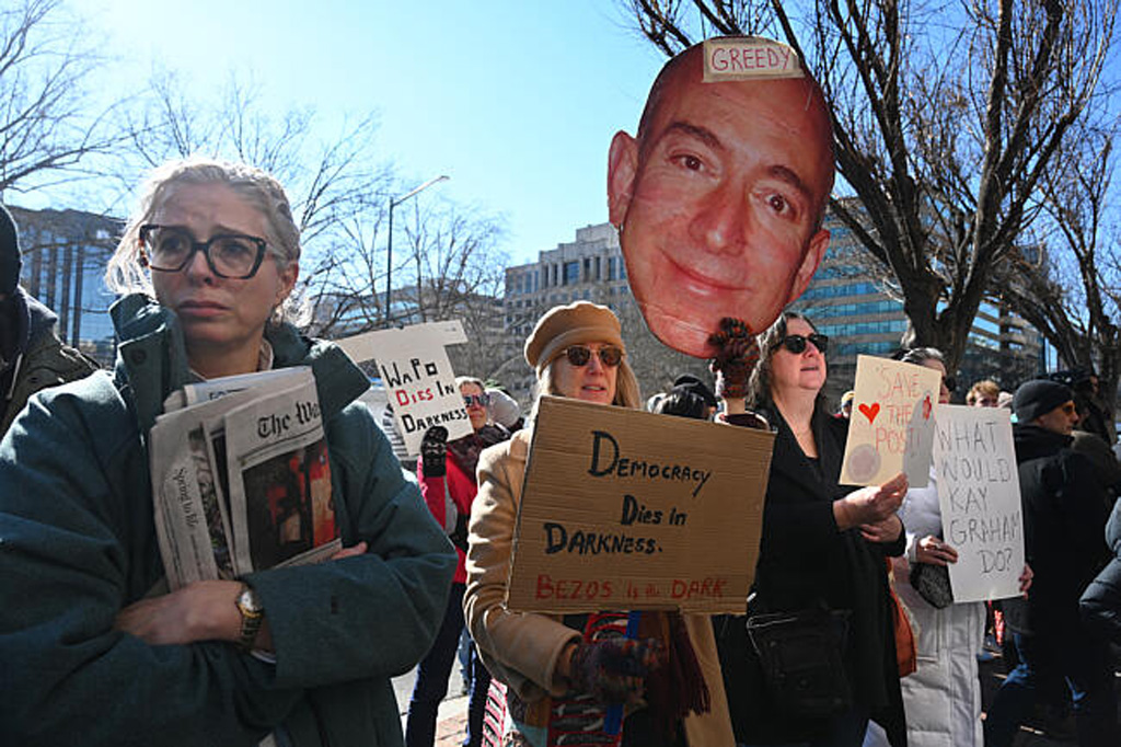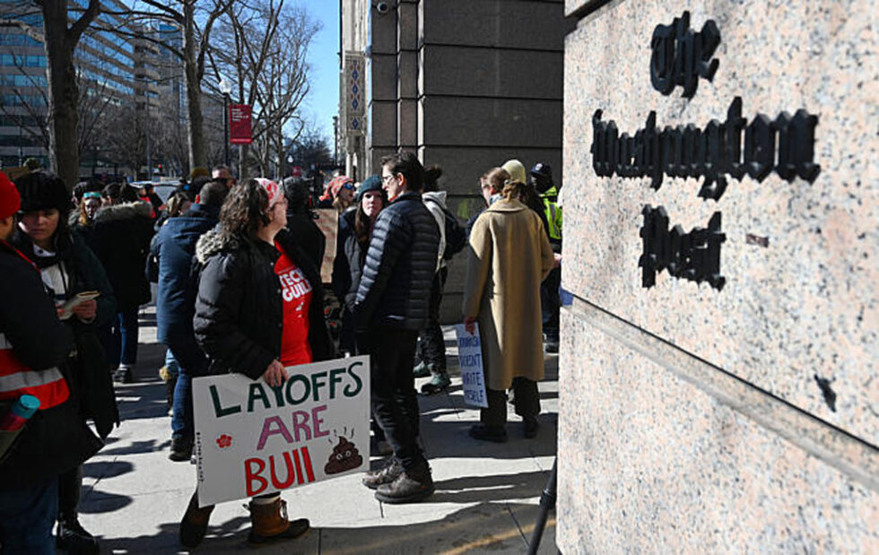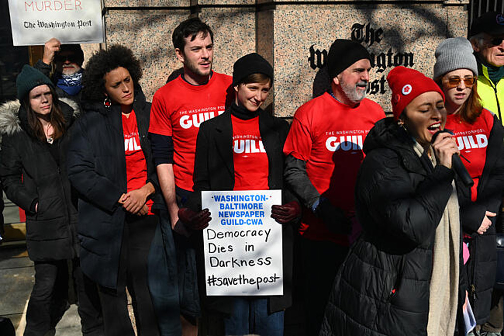 Des membres du syndicat et leurs sympathisants se rassemblent devant le Washington Post pour un rassemblement « Sauvons le Post » après l’annonce de licenciements massifs le 5 février 2026 à Washington, D.C.