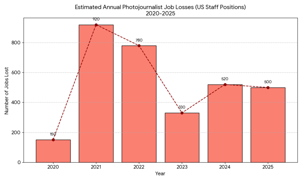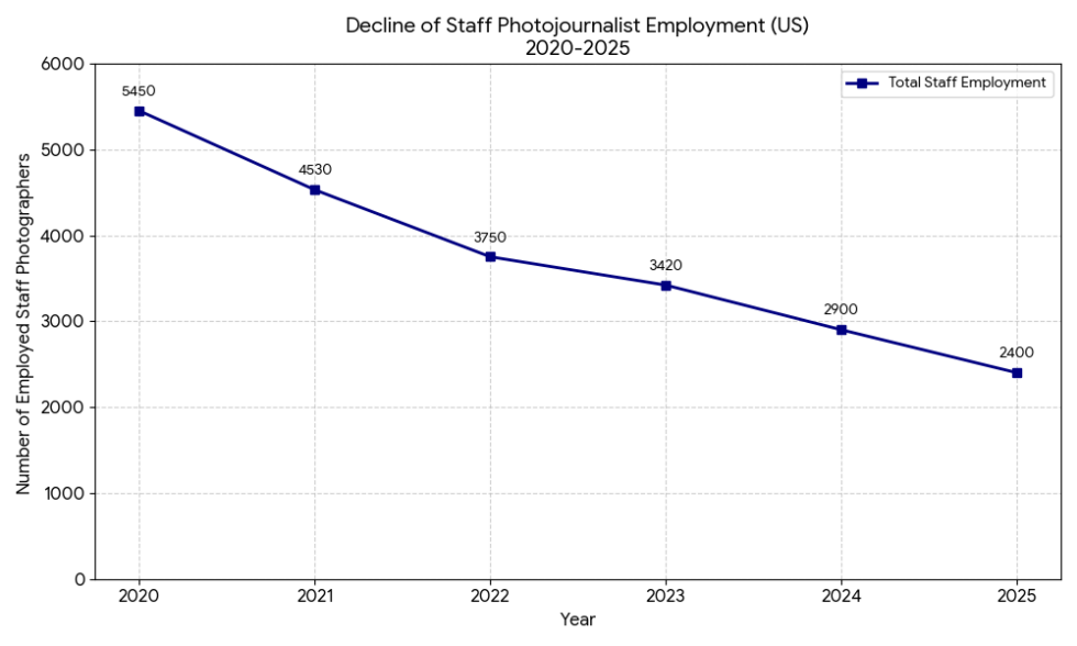 Les photojournalistes ont historiquement été les « plus durement touchés » parmi les catégories de salles de rédaction, perdant souvent leurs postes salariés plus rapidement que les reporters ou les éditeurs, les médias pivotant vers des modèles de pigistes ou de contenu généré par les utilisateurs.