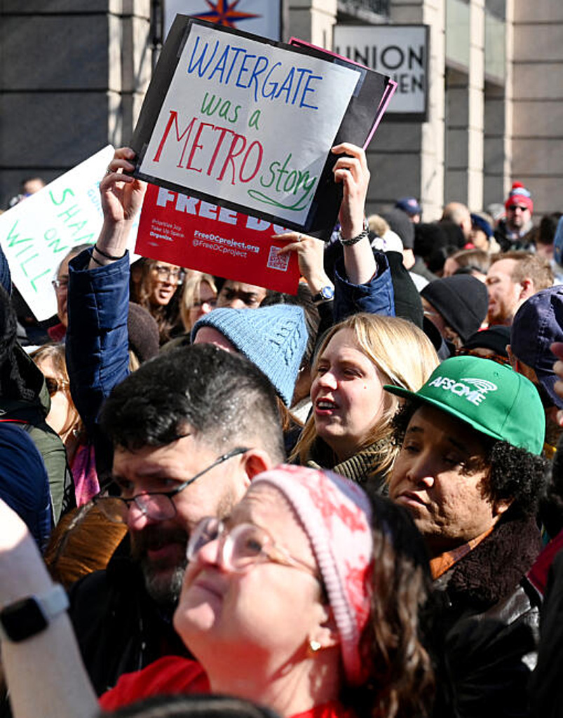 Des membres du syndicat et leurs sympathisants se rassemblent devant le Washington Post pour un rassemblement « Sauvons le Post » après l’annonce de licenciements massifs le 5 février 2026 à Washington, D.C.