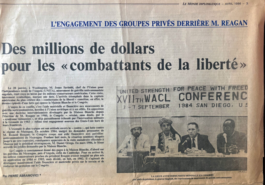L’enquête menée aux États-Unis et en Europe est parallèle à celle des journalistes américains. Nous allons nous rencontrer à la conférence de la Ligue mondiale anticommuniste, à Dallas, organisée par d’anciens militaires et agents de la CIA, afin (soi-disant) de faire de la collecte de fonds et de préparer de l’aide humanitaire pour soutenir les « combattants de la liberté » anticommunistes de divers pays dont le Nicaragua, l’Afghanistan ou l’Angola.