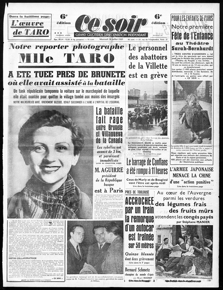 Elle fut la première femme photojournaliste qui a illustré au plus près la guerre civile espagnole aux côtés des Républicains avec comme seules armes ses appareils photos. Les photos de Gerda Taro et de Robert Capa sont devenues iconiques. Elle est morte le 26 juillet 1937 à l’Escurial en Espagne écrasée par un char alors qu’elle prenait des photos. Lors de son enterrement au cimetière du Père Lachaise à Paris, plusieurs milliers de personnes ont suivi son cercueil.