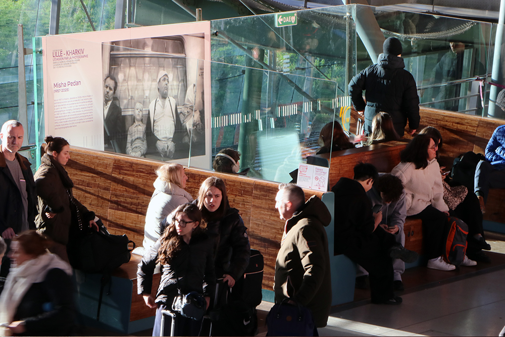 Dans le hall de la gare Lille-Europe, le panneau qui présente Misha Medan de la seconde époque de l’Ecole photographique de Kharkiv.