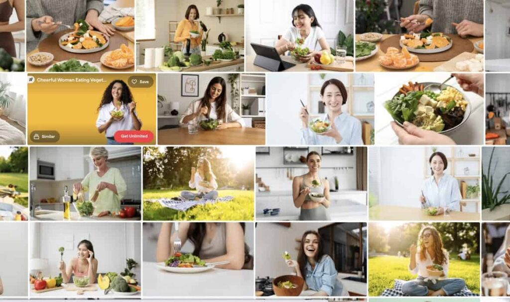 Capture d’écran d’une recherche Shutterstock pour « woman eating salad » — le sourire est de rigueur
