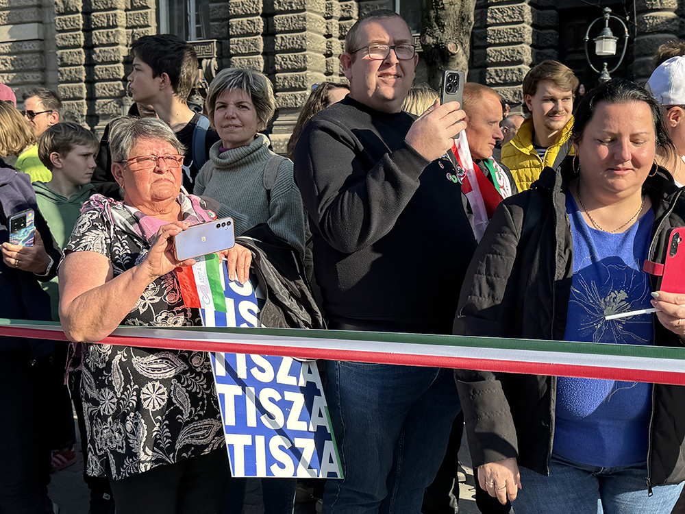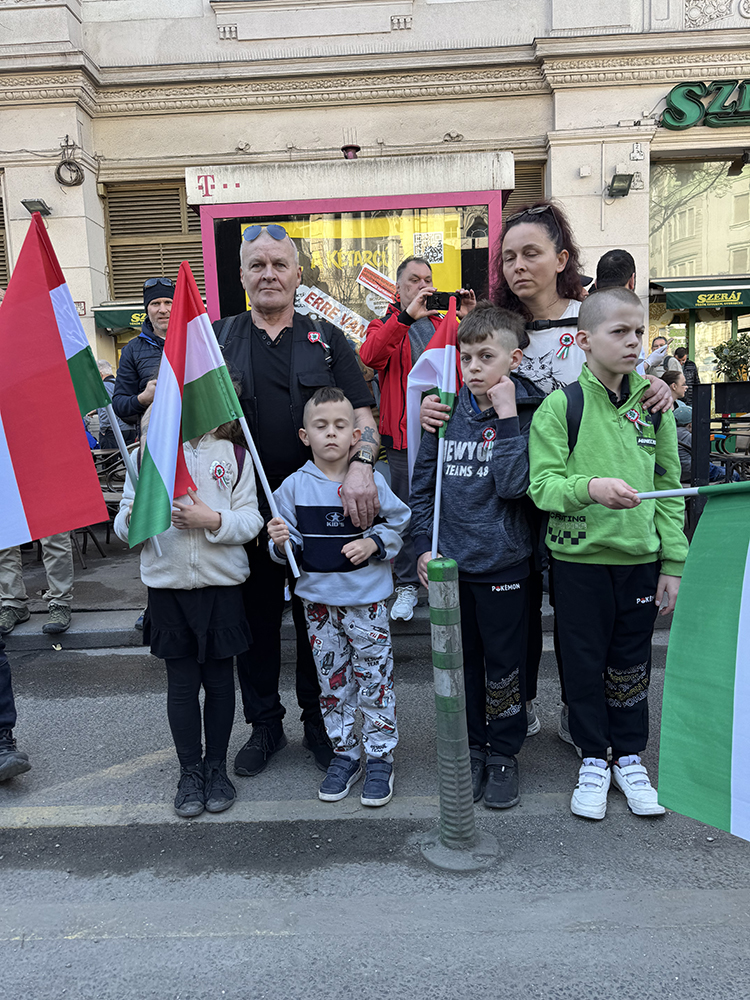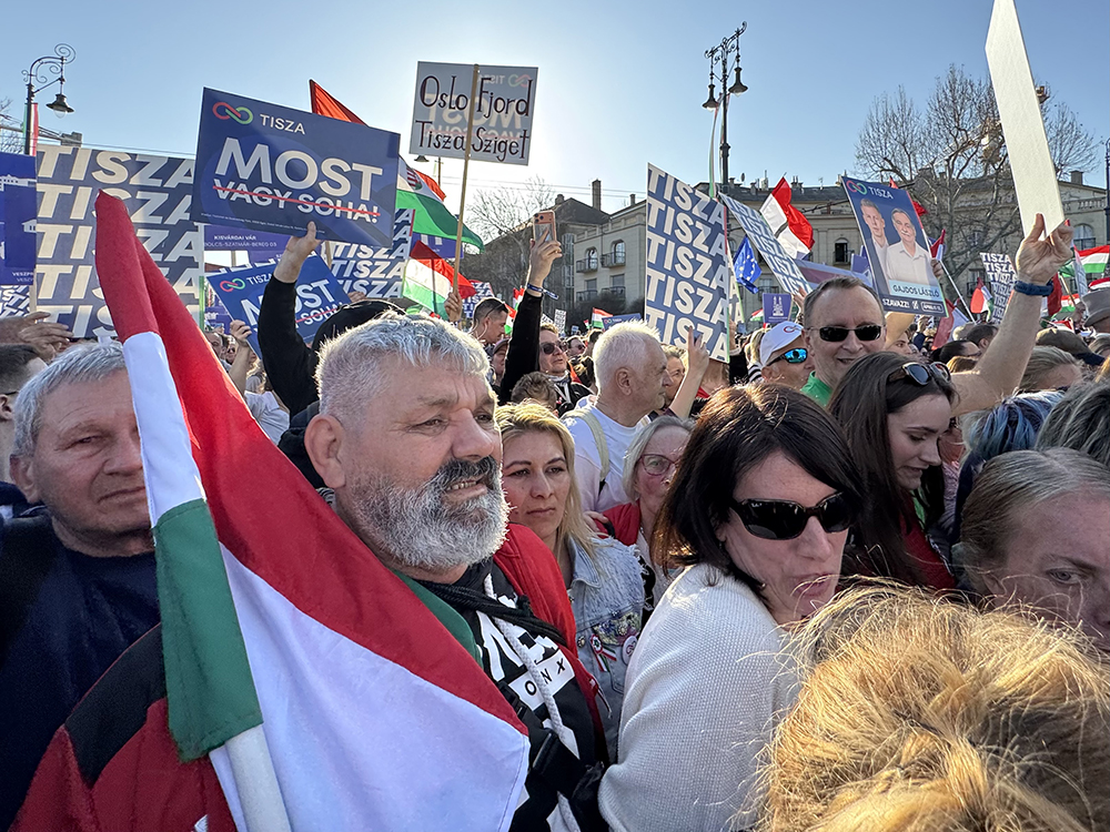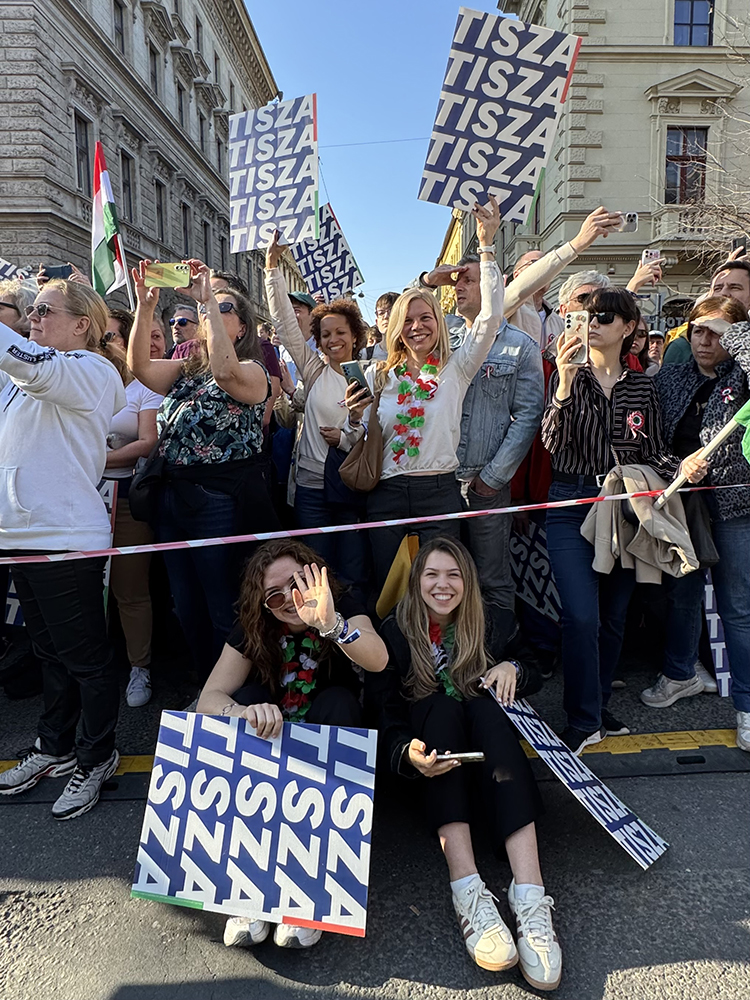 Pour un photojournaliste, cette soirée était donc idéale. Sourires éclatants, libération des corps et de la parole, lumière de printemps. Dimanche soir, les rives du Danube et le Parlement étaient baignés d’une belle lumière qu’il n’était pas nécessaire d’apprivoiser. La foule de tous âges (beaucoup de jeunes qui n’avaient connus qu’Orban et qui votaient pour la première fois) et de toutes conditions, étaient venues en masse au rassemblement organisé par les partisans de Péter Magyar Tisza. D’une même voix, ils n’arrêtaient pas de crier « Saleté de Fidesz », « Hongrie, Europe », « Voldemort est vaincu! » ou « Les Russes rentrez chez vous ! » comme pendant l’insurrection de 1956 lorsque la population s’était soulevée contre l’occupation des Soviétiques.