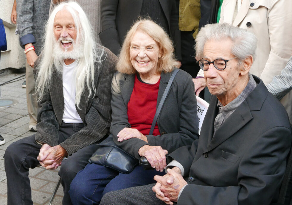 01 – Dernière apparition publique de Gabor Szilasi (à droite sur la photo), en compagnie du sculpteur Armand Vaillancourt et de la peintre Françoise Sullivan lors de l’inauguration de la murale hommage en 2024.