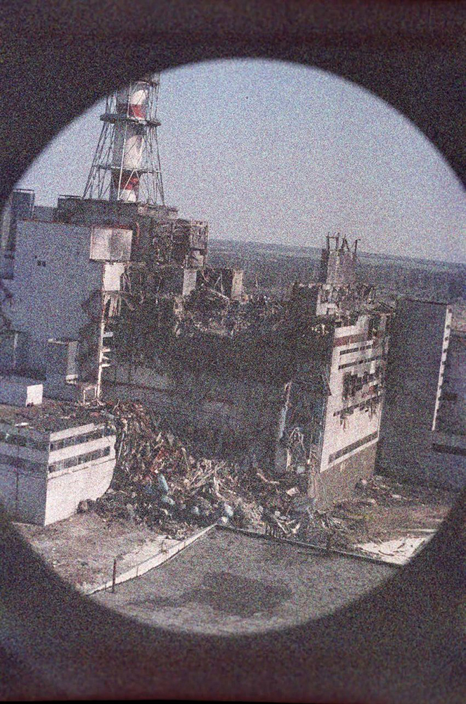 Le 26 avril au matin, Anatoly Rasskazov, photographe officiel de la centrale, est convoqué d’urgence pour être envoyé en hélicoptère sur place par les autorités qui, courageusement réfugiées dans un bunker, voulaient savoir ce qui s’était réellement passé. Comme les cendres volaient de partout et rendaient toute prise de vue impossible à travers les hublots, le photographe demanda l’ouverture d’une porte malgré les vives protestations des autres passagers conscients des dangers que cela représentait. Penché dehors, retenu par un soldat, il réalise la première photographie du réacteur détruit. Sur ordre du directeur de la centrale Viktor Bryukhanov, il du aller ensuite photographier également depuis le sol, exposant au total deux pellicules. Un premier film développé après la mission, était entièrement noir, brûlé par les radiations, probablement à cause des blocs de graphite qui jonchaient le sol. L’autre était voilé mais relativement utilisable. Immédiatement, le KGB saisit ses images et lui ordonna de ne pas parler de ce qu’il avait vu et photographié. Pendant ce vol, Rasskazov fut exposé à une dose de radiation équivalente à 3000 mSv soit 150 fois plus que la limite annuelle maximale pour un travailleur du nucléaire. Il mourut le 17 février 2010, après des années de souffrance liées à des cancers et à des maladies du sang qu’il attribuait aux radiations reçues.