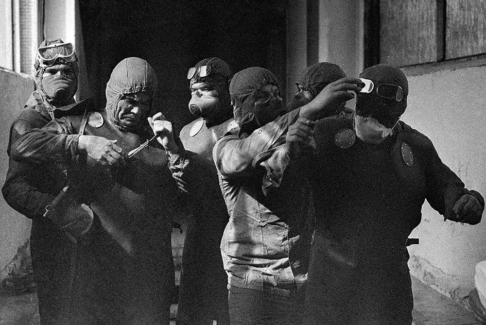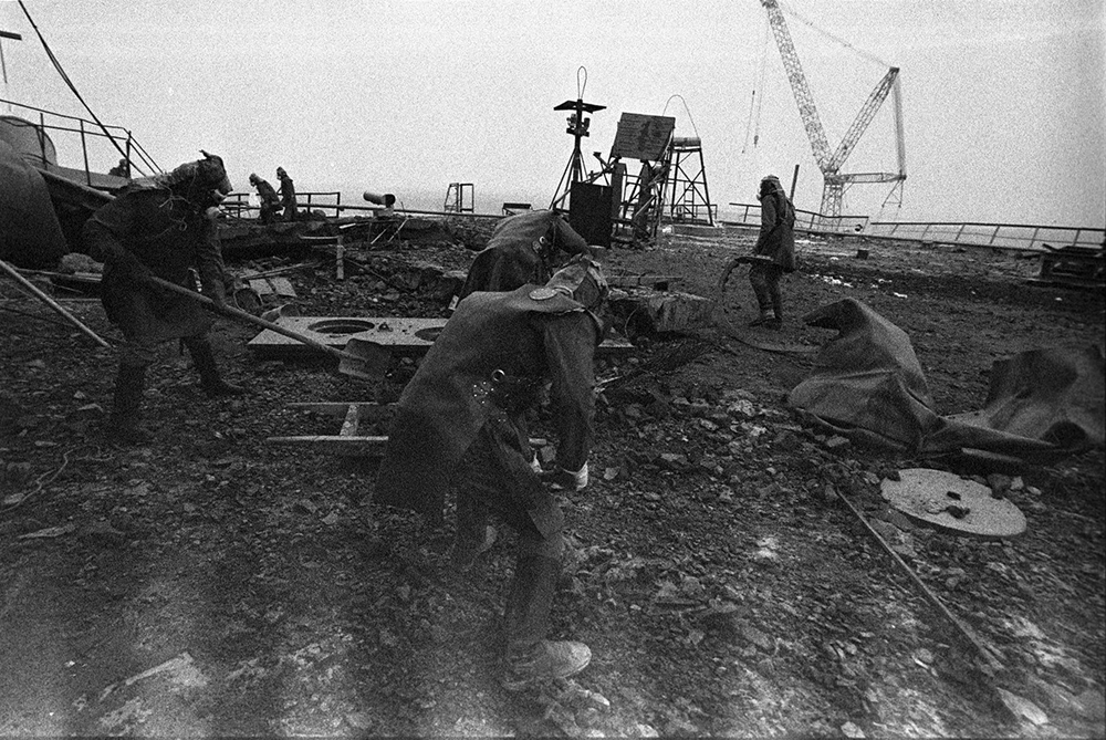 Ce qui va distinguer Kostine des autres photographes, c’est son acharnement à documenter la catastrophe de l’intérieur. Il décida d’accompagner les hommes chargés de nettoyer les dégâts, qu’on appellera les liquidateurs, sur le toit du bloc n°3, adjacent au réacteur éventré, un endroit hautement contaminé et très dangereux. Des équipes de huit individus se relayaient toutes les quarante secondes, harnachés de tabliers de plomb et de protections bricolées, pour enfourner des pelletées de débris radioactifs dans la fosse creusée par l’explosion. En une semaine, il y retourna cinq fois. Pour contourner le problème des pellicules brûlées par les radiations, il emmaillotait ses appareils dans des feuilles de plomb. « Dans l’urgence, on distribua des masques et des protections. Les premiers masques que l’on nous donne nous font des têtes de cochons. On les appelle entre nous des muselières ou des groins. Ils sont horriblement mal conçus. Après deux heures de port, la bouche se couvre d’ulcères à cause de la chaleur et la mauvaise circulation de l’air. » « Sacha Iourtchenko monte sur le toit avant moi. Il y promène son dosimètre. Il cherche l’endroit d’où je peux prendre des photos sans courir trop de risques. Puis il revient en courant et se cache derrière un mur épais. C’est à moi de jouer. Je monte, frappé par un étrange sentiment mystique. J’ai l’impression d’être sur une autre planète. Tout est recouvert par le fuel, un mélange de carburants radioactifs. Mes mains tremblent. Je ne sais plus où je suis, mais je prends des photos quand même. A peine une minute plus tard, je sens un coup sur mon épaule et puis une voix qui me dit « Putain, mais dépêche-toi ! Je bouffe plein de radiation à cause de toi. Rentre vite maintenant ! » Sasha me pousse à l’intérieur de l’abri. »
