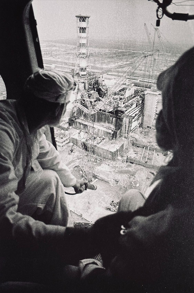 Il fait encore nuit ce samedi-là quand Igor Kostine, photographe de l’agence Novosti, reçoit un appel téléphonique. C’est un ami pilote d’hélicoptère qui lui annonce la nouvelle et lui propose de l’embarquer pour le vol de reconnaissance qu’il doit effectuer. Parti de Kiev et arrivé sur le site en fin de matinée, il a le temps de faire vingt photos avant que son appareil ne se bloque. Les images une fois développées se révèlent être complètement noires du fait de la radioactivité, seule la première est exploitable et ce sera une des rares photos du réacteur faite le jour même de la catastrophe.