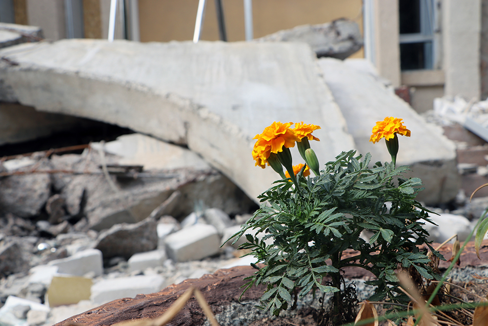 Dans cette exposition, des vitrines présentent des débris provenant de la destruction d’une école. Pourquoi présenter des débris et comment as-tu eu cette idée ?
