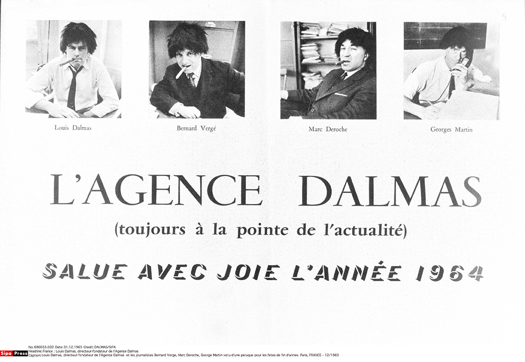 Louis Dalmas, directeur-fondateur de l’Agence Dalmas et les journalistes Bernard Verge, Marc Deroche, George Martin vetu d’une peruque pour les fetes de fin d’annee. Paris, FRANCE – 12/1963 /Credit:DALMAS/SIPA/1408071859