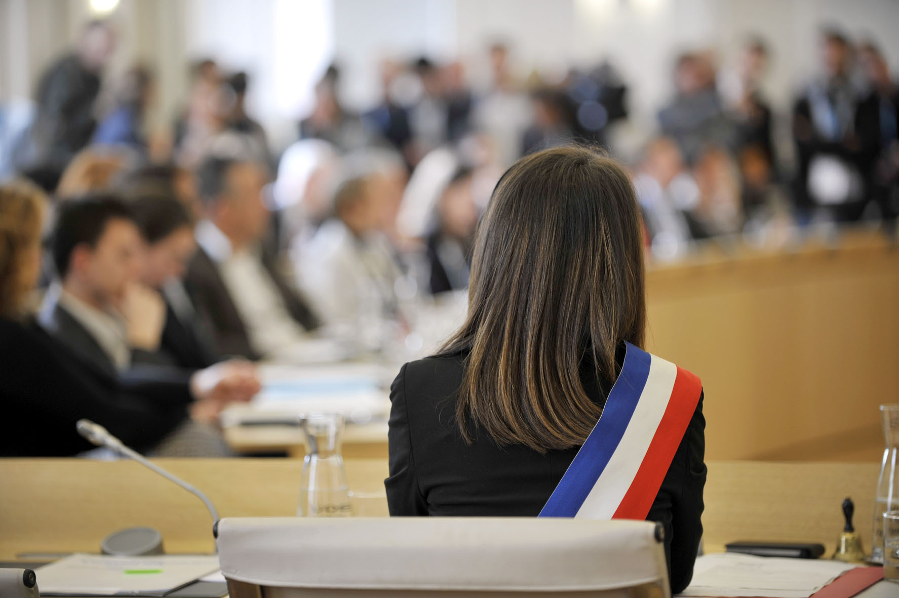 Nantes (44). 04/04/2014. Mairie. Le conseil municipal réuni en séance lors de l’élection du nouveau maire de la ville Johanna Rolland. Ici au premier plan, plan serré, vue de dos ceinte de son écharpe tricolore. C’est la première femme maire de Nantes./